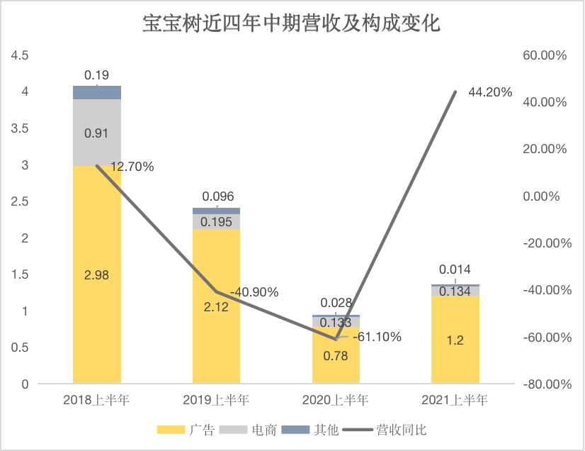 事實上,寶寶樹的電商業務成長並不亮眼。與2020上半年電商收入1332萬元相比,2021年上半年電商收入僅增長0.4%,仍未達到2019年的水平。比起“稍微復甦”,其電商業務更像“退無可退”。