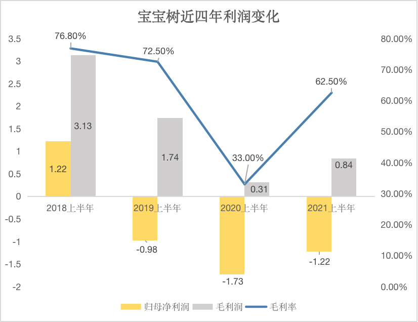 比營收低迷更麻煩的是,寶寶樹處於持續虧損中。對比過去四年寶寶樹的中期業績,除了2018上半年出現短期盈利外,其餘年份均出現鉅額虧損。雖然寶寶樹在財報摘要中特別指出2021上半年虧損1.225億元,同比收窄29.2%,但和2019上半年虧損0.98億元相比,其虧損依然呈擴大的趨勢。
