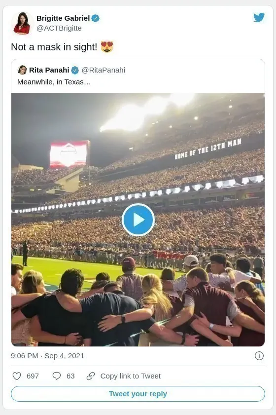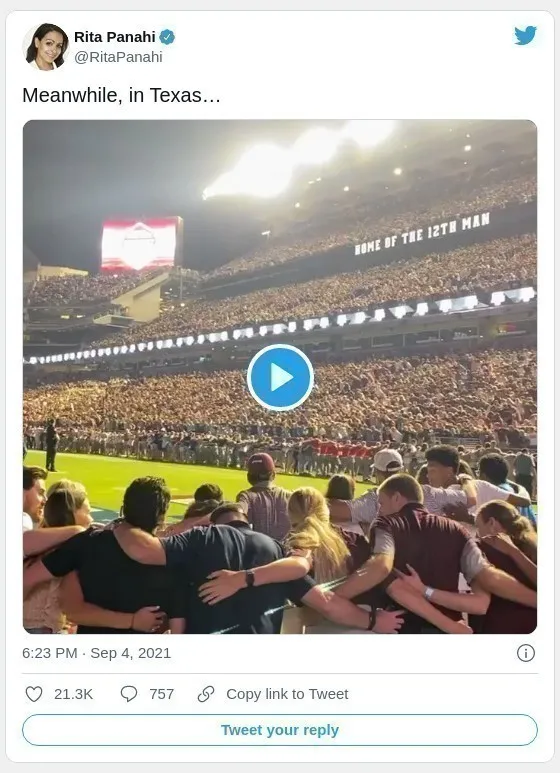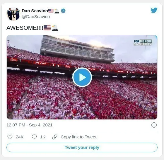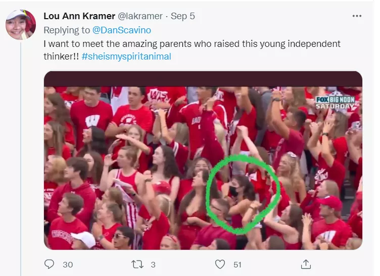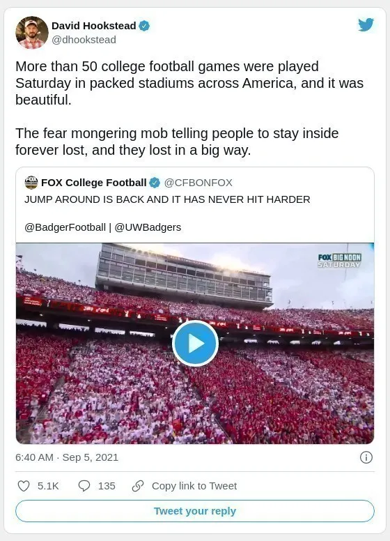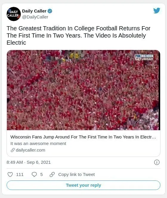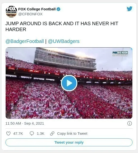 9月4日,在威斯康星州麥迪遜的威斯康星大學UW的蘭德爾營體育場,自651天(Pandemic) 以來,舉行第一場UW橄欖球比賽。當“跳一跳 “的音樂響起的時候,容納8萬人的球場,全場MAGA的紅潮湧動,每個人歡跳,很久沒看到這樣的場面了!