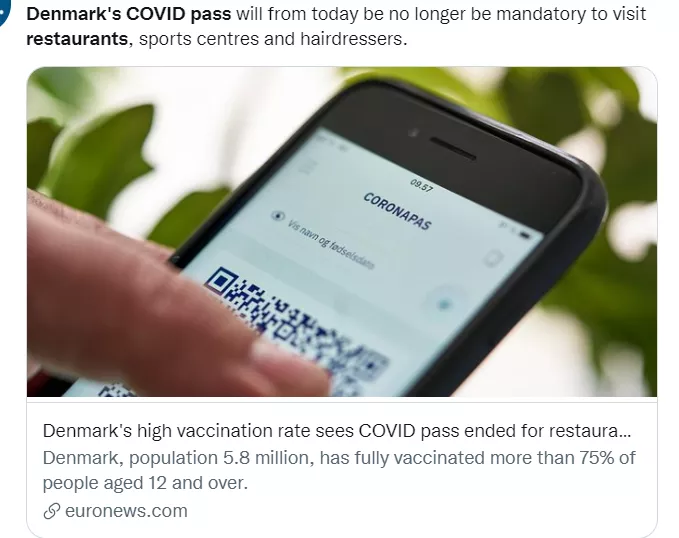 丹麥衞生部表示,由於新冠病毒不再對社會構成嚴重威脅,將於9月10日起取消所有防疫限制,包括疫苗護照。