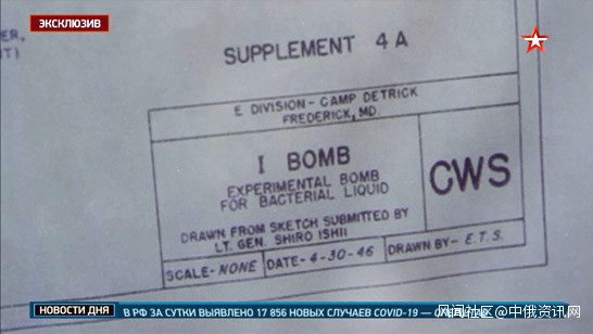 哈爾濱陳列館中展示的細菌炸彈彈頭的設計圖紙副本上蓋着美國德特里克堡製作的印章,上面寫着設計圖草圖正是由731部隊石井四郎提供。