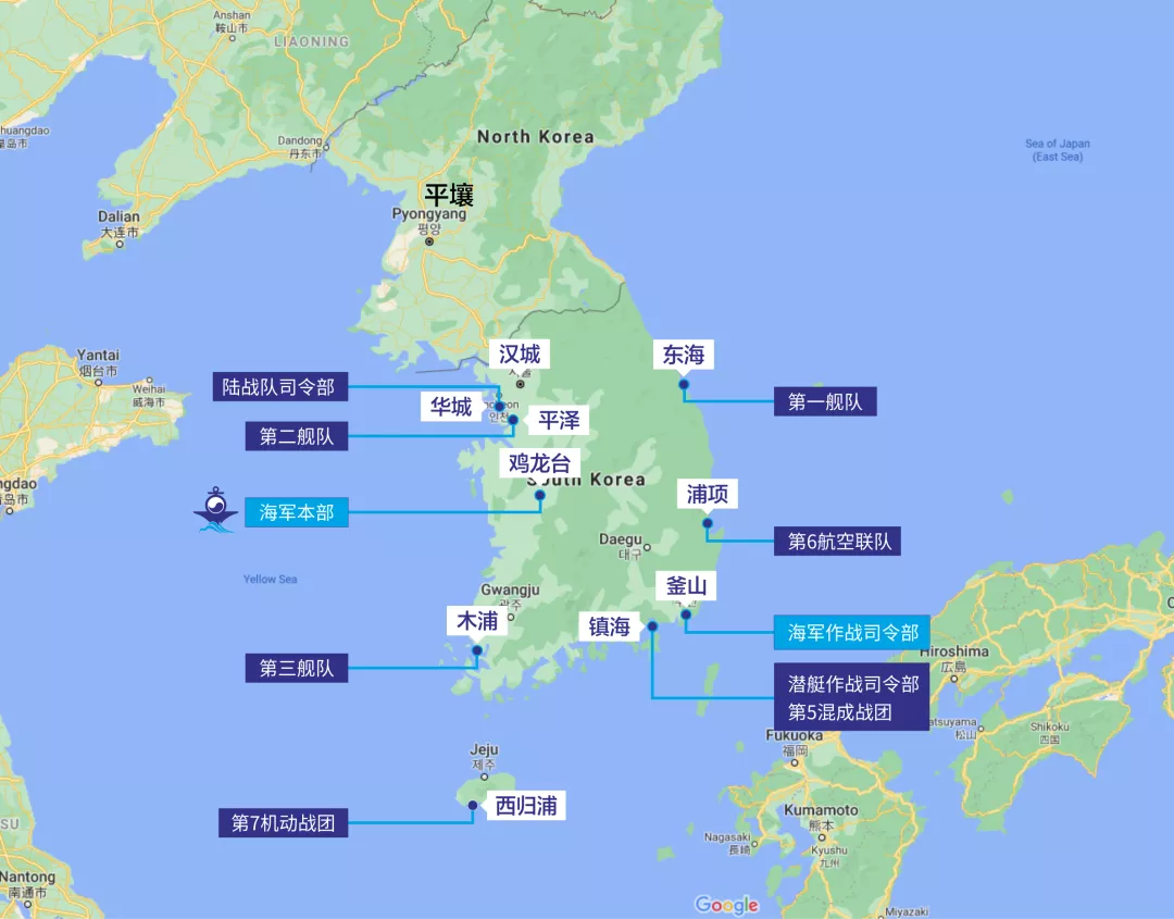 韓國海軍的主要基地有鎮海、釜山、濟州、東海、平澤、木浦、仁川、浦項和白翎島。
