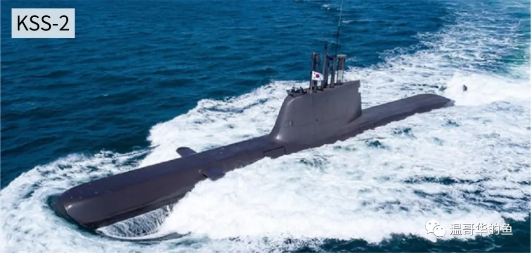KSS-2為引進生產許可證在本土建造的德國214型潛艇,從2007年到2020年共服役9艘。水下排水量1860噸,採用質子交換膜燃料電池AIP技術,自持力從KSS-1的50天延長到84天,其中水下連續活動時間達到3星期以上,為中國039A型之後亞洲第二個裝備AIP系統的潛艇。8具533毫米魚雷發射管中有4具擁有“捕鯨叉”潛射導彈發射能力。