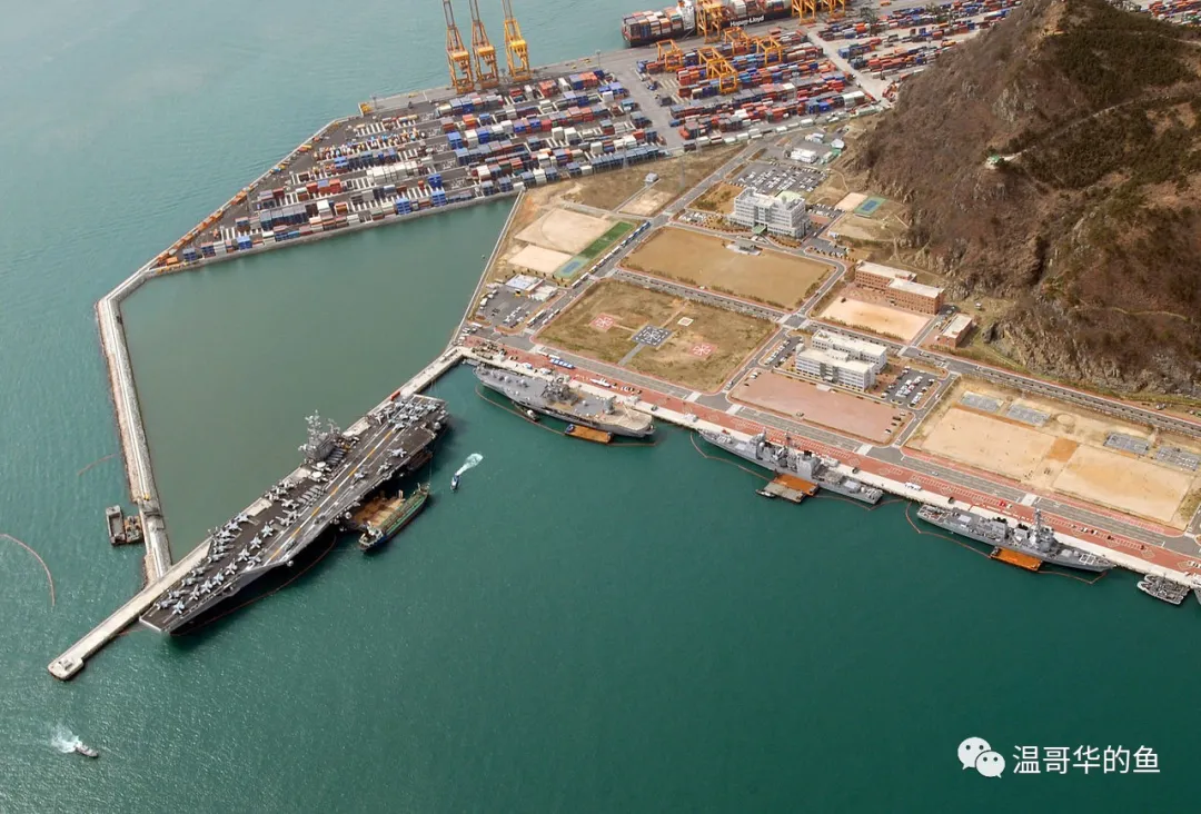 > 2009年3月12日,“斯坦尼斯”號打擊羣和第七艦隊旗艦“藍嶺”號停泊在釜山基地
