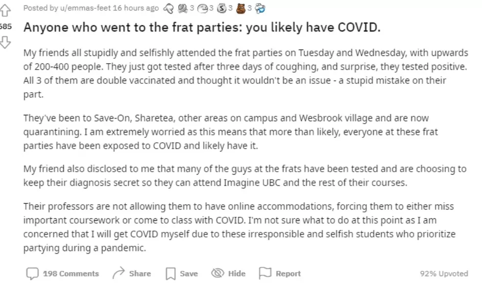 在Global News報道之前,已有同學在Reddit上爆料,這次在兄弟會迎新派對上確診的學生計劃堅持參加開學的imagine day活動,而且,在學校能去的地方都去過了,涉及的範圍廣、人數多,對校園造成相當大的潛在風險!