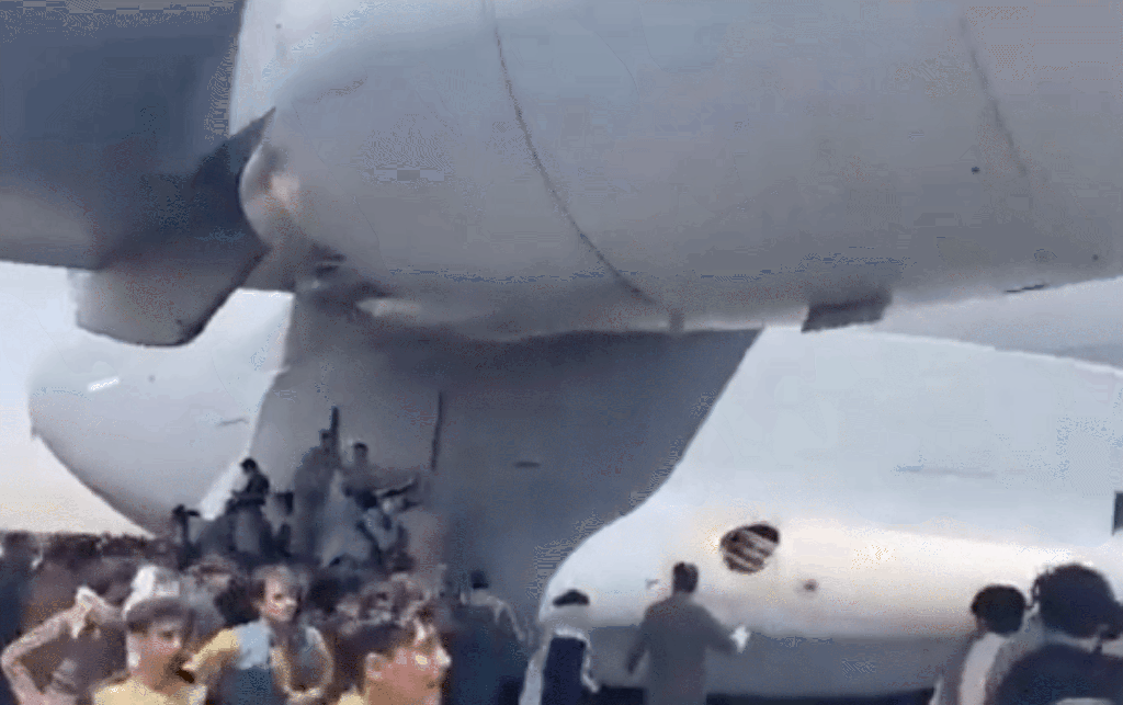 ▲ 2021年,“他們一無所有,但他們獲得了自由”:數千名阿富汗人湧入喀布爾卡爾扎伊國際機場跑道,試圖追逐並登上正要起飛的美軍C-17運輸機。