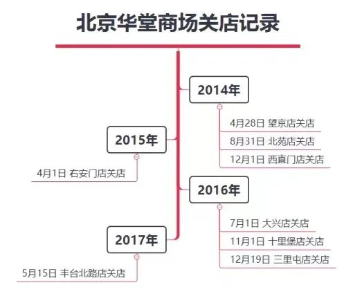 但北京業務和成都業務形成了鮮明的對比,成都業務蒸蒸日上,整體營業額接近60億元,但北京華堂商場卻節節敗退。自2014年開始,華堂商場開始接連在北京關店,如今只剩下亞運村店一根“獨苗”。