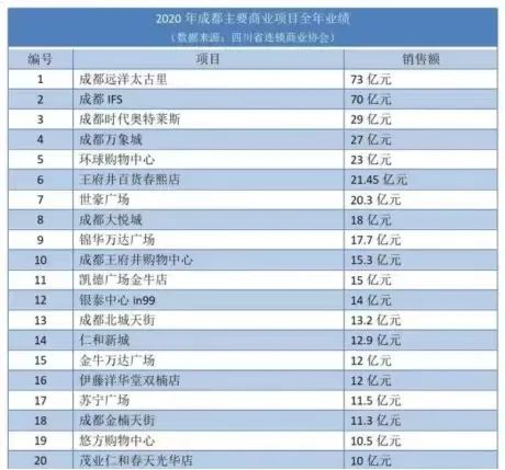 隨之,定位於中端百貨的伊藤洋華堂在成都人民的影響力也在逐漸減弱,2020年成都主要商業項目的業績中,伊藤雙楠店以12億元的銷售額排在第15位,排在前列的大多都是太古裏、IFS、萬象城這樣的購物中心。