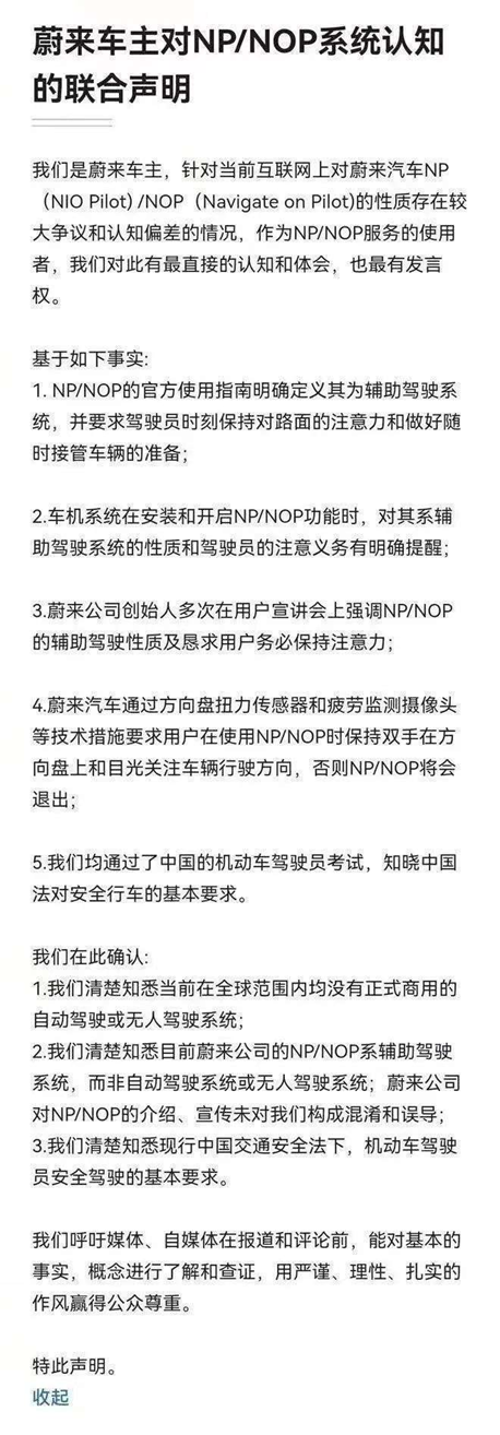 當外界質疑蔚來此前過度宣傳自動駕駛,導致出了“事故”時,也有蔚來ES8創始版車主林蔚發佈微博,稱500名蔚來的車主發佈了“聯合聲明”,聲稱:
