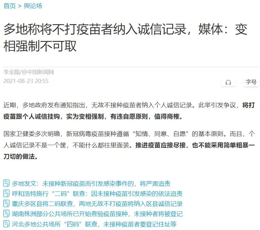 之前,全國多地出現變相強制打疫苗現象,如湖北鄂州市、十堰市,河南駐馬店等地,在被輿論關注後陸續取消。