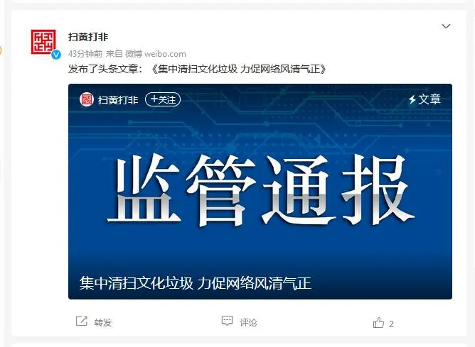 9月7日**,**@掃黃打非 通報“淨網”集中行動階段成果:按照全國“掃黃打非”工作小組部署,中央宣傳部、中央網信辦、工業和信息化部、公安部、文化和旅遊部、國家廣播電視總局今年6月起共同開展的“淨網”集中行動,目前取得階段成效。六部門着重整治網上歷史虛無主義、涉黃涉非、涉低俗等有害信息,深度清理有悖社會主義核心價值觀的網絡內容。
