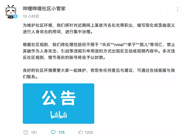 9月6日晚間,“嗶哩嗶哩社區小管家”在B站發文稱,為維護社區環境**,B站將針對近期網上某些污名化光榮職業,縮寫簡化或歪曲語義進行人身攻擊的用詞,進行集中治理。**多次違反社區規則,情節惡劣的賬號將會予以封禁。