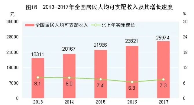 快速發展為 “ 共同富裕 ” 夯實了基礎。2017 年,全國居民人均可支配收入 25974 元,比 1978 年實際增長 22.8 倍,年均實際增長 8.5%。