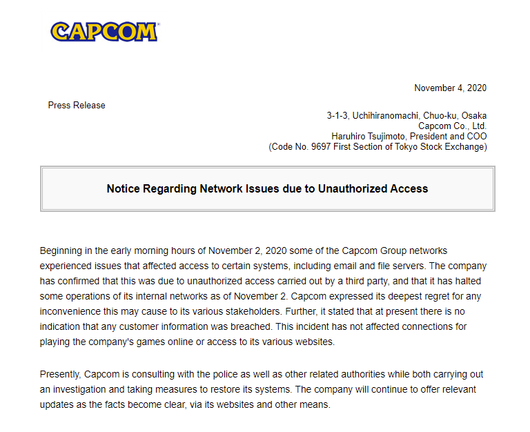 卡普空表示已經聯繫了警方調查,可是他們沒想到黑客開始對資料進行大量的爆料。