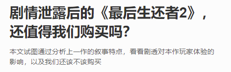 《 最後生還者 2 》這種單機大作也遭遇過內容泄露,連結局都被爆料了出來,這類遊戲玩家很大一部分就是衝着劇情去的,結局一出來,這劇透的酸爽誰能頂得住啊?