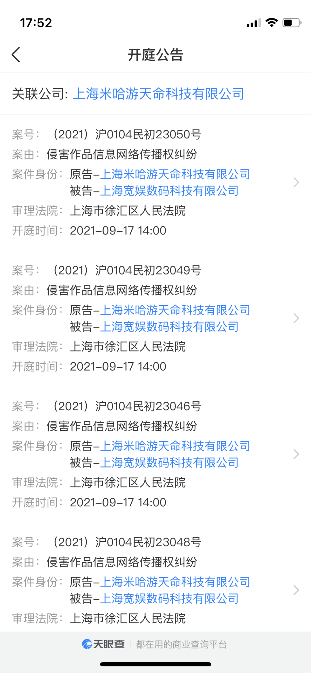 天眼查顯示米哈遊以 “ 侵害作品信息網絡傳播糾紛 ” 為由連續告了 B 站 7 次。