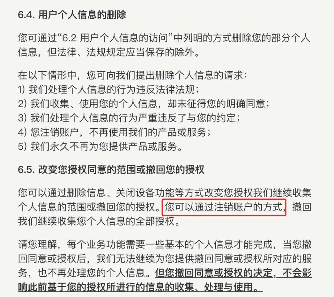 記者查詢了多個App的隱私協議,大多表示,如果想要撤回授權或者刪除個人信息,可以通過主動註銷賬户的方式,撤回其繼續收集個人信息的全部授權,同時也説明,註銷賬户之後,將停止提供產品或服務。