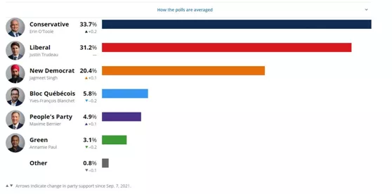 目前,保守黨支持率仍保持着對執政黨自由黨的領先。一項最新民調還顯示,多數加民眾“希望下屆政府對中國更強硬”。