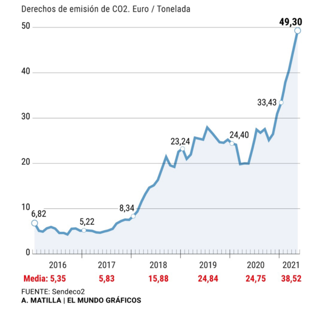 自 2005 年以來,歐洲創立了排放交易系統(Emission Trading System,簡稱ETF),該系統限制了 10,000 個能源密集型設施(發電廠和工廠)和航空公司的二氧化碳排放。所有這些公司都必須監控、核實並向相應的國家機構報告其碳排放量,在西班牙需向西班牙氣候變化辦公室(la Oficina Española de Cambio Climático)報告。它們都被分配了有限數量的二氧化碳排放權,可以免費排放到大氣中。如果需要排放超過分配數量的,則可以通過ETF的框架購買配額。