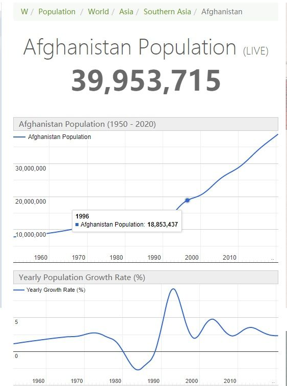 在塔利班第一次奪取全國政權之後,阿富汗的人口幾乎是翻了一倍,現在60%以上的阿富汗人在1996年後出生(*0–14 years:*40.62% (male 7,562,703/female 7,321,646),*15-24 years:*21.26% (male 3,960,044/female 3,828,670)),而糧食產量在這二十多年來一直就在一個區間內打轉