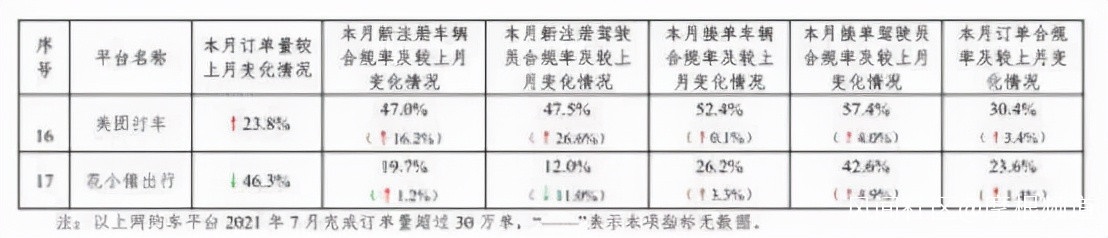 在第三方平台用户與司機羣體投訴量暴漲的同時,據全國網約車監管信息交互平台統計,2021年7月訂單量超過30萬單的網約車平台共17家,其中當月訂單合規率較上月環比下降的平台佔近6成,接單車合規率較上月環比下降的平台佔比約53%,當月新車註冊車輛合規率在60%以上的不滿50%。