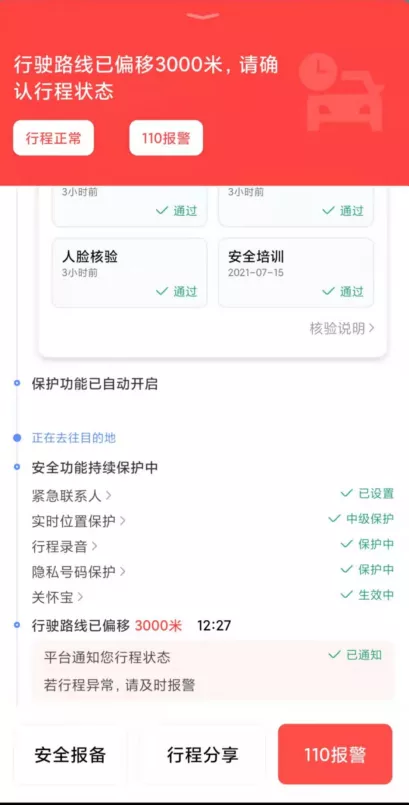 而就摩根頻道近兩個月的網約車體驗中,滴滴出行訂單行駛中與原計劃路線偏離時,會向用户發出警告,自動開啓保護功能等。但是在高德平台上某次行程中,由司機以不同軟件接多個訂單的原因,在與原目的地反向而馳的行駛之中,高德平台並未發出預警,而是在重新規劃路線。