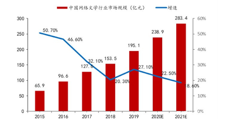 近幾年,網絡文學的經濟結構不斷進化。在多種模式之下,這也推動了網文市場規模的高速增長。據艾媒諮詢數據顯示,2020年中國整體在線閲讀規模達到5.3億人。讀者基數的龐大決定了網文閲讀市場隨之龐大。根據國聯證券數據報告,2021年國內網文市場規模將達到283億。