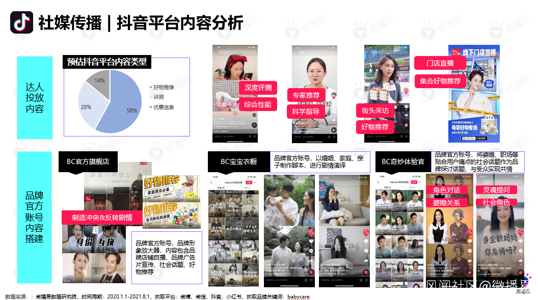 在抖音平台,Babycare採用中腰部、腰尾部和素人KOC的達人組合。多選用母嬰育兒類賬號,同時結合日常生活、旅遊等多類型賬號觸達寶媽羣體。