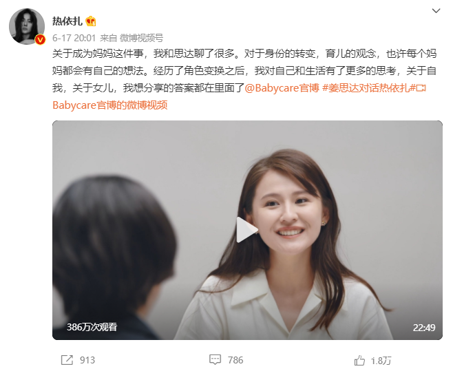 5月19日,品牌又瞄準熱依扎這一影視明星的媽媽代表,並找到姜思達獨家採訪熱依扎,分享自己在有了女兒之後的人生轉變,和女兒相處的方式,為Babycare品牌形象做出積極正面的提升。618前一天,熱依扎、姜思達、品牌方及娛樂類、情感類等多位頭部博主矩陣發佈,為618大促積攢聲量。