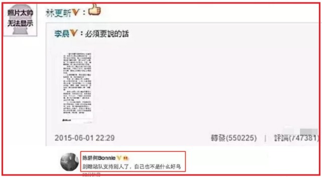 就在2015年的時候,範爺插足“李晨”的感情,李晨手撕張馨予的一篇文章,洋洋灑灑,林更新點贊“微博”,陳碧舸轉手一個評論很是“精準”。陳碧舸説“別瞎站隊支持別人了,自己也不是什麼好鳥”。