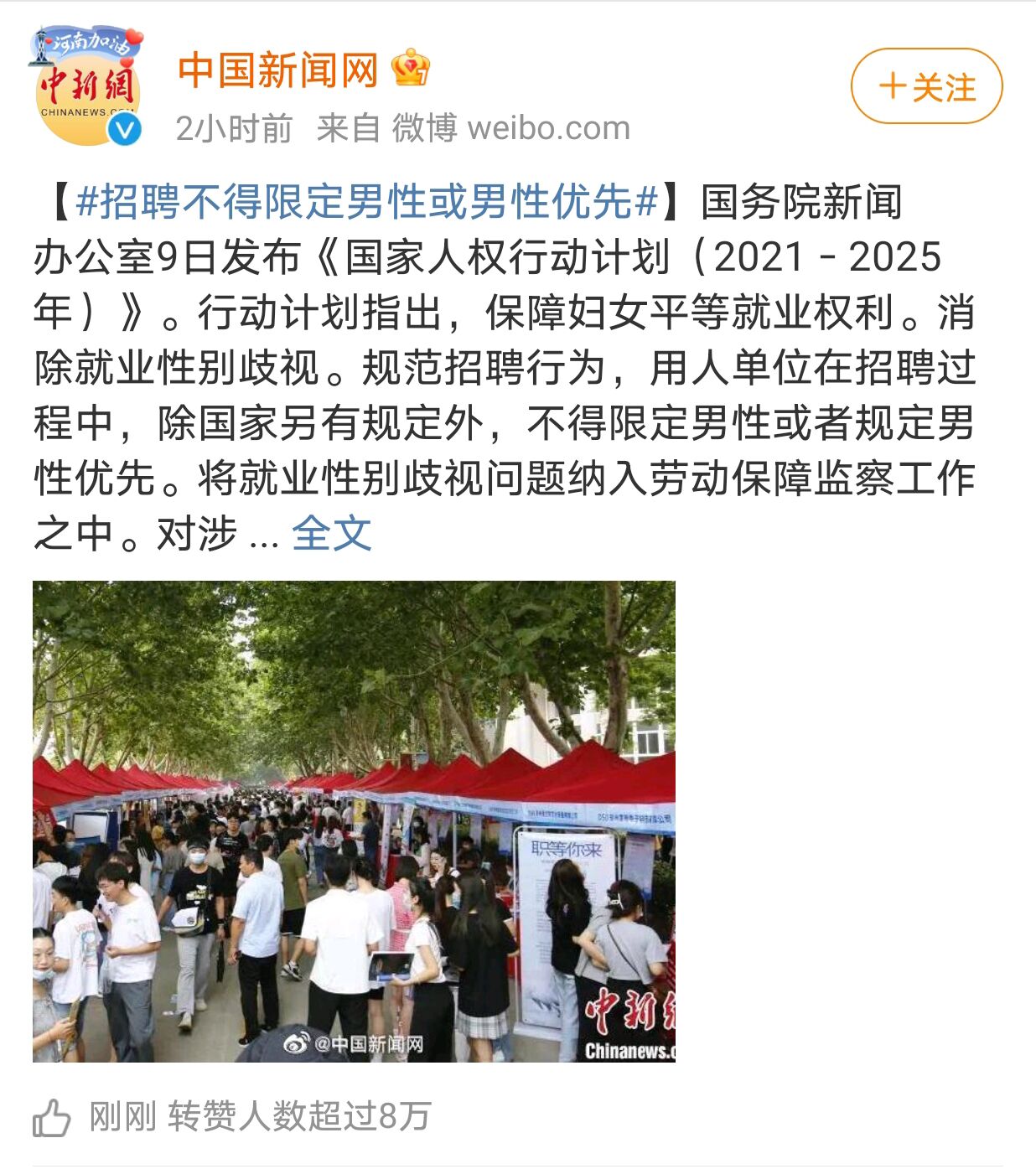 逛微博的時候,看到一條上榜的熱搜,是有關國務院剛發佈的一條關於職業招聘時不得限定男性或男性優先的政策規定。