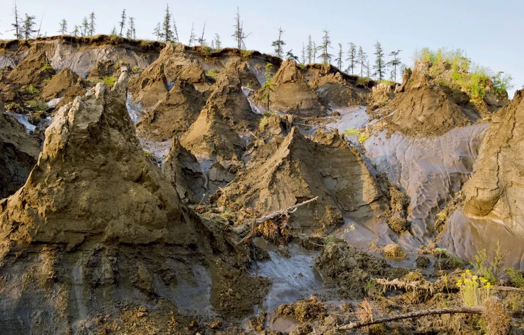 被冰凍超過200萬年的西伯利亞凍土層,融化並垮塌進入河谷。