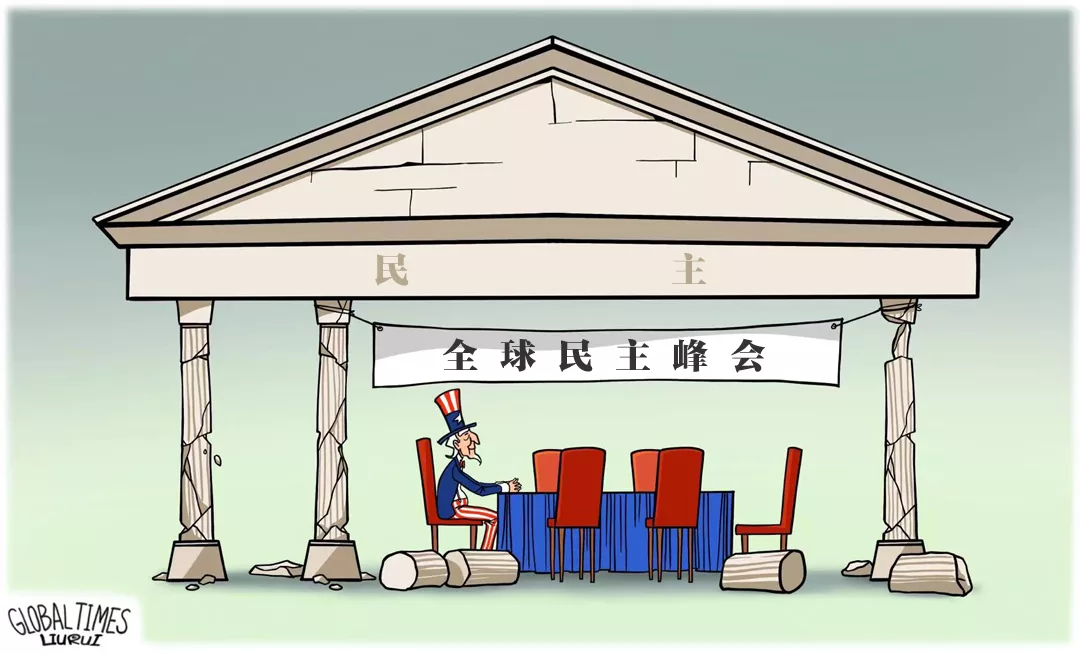 ▲美國心心念唸的“全球民主峯會”,不會成為“普世價值”的高光時刻,而將見證“美式民主”的夕陽西下。(漫畫 | 劉蕊)