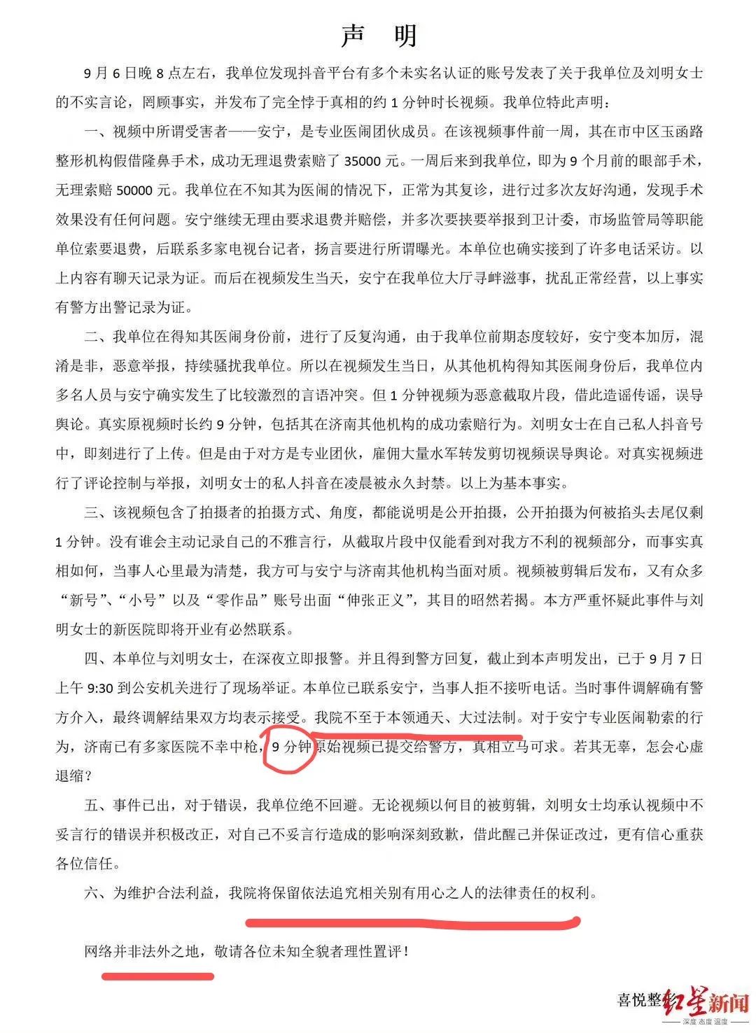 在熱搜被撤不久後,濟南喜悦整形就發了一篇「官方聲明」,稱被打的安女士是專業醫鬧,網上的視頻都是被惡意剪輯後,故意中傷。