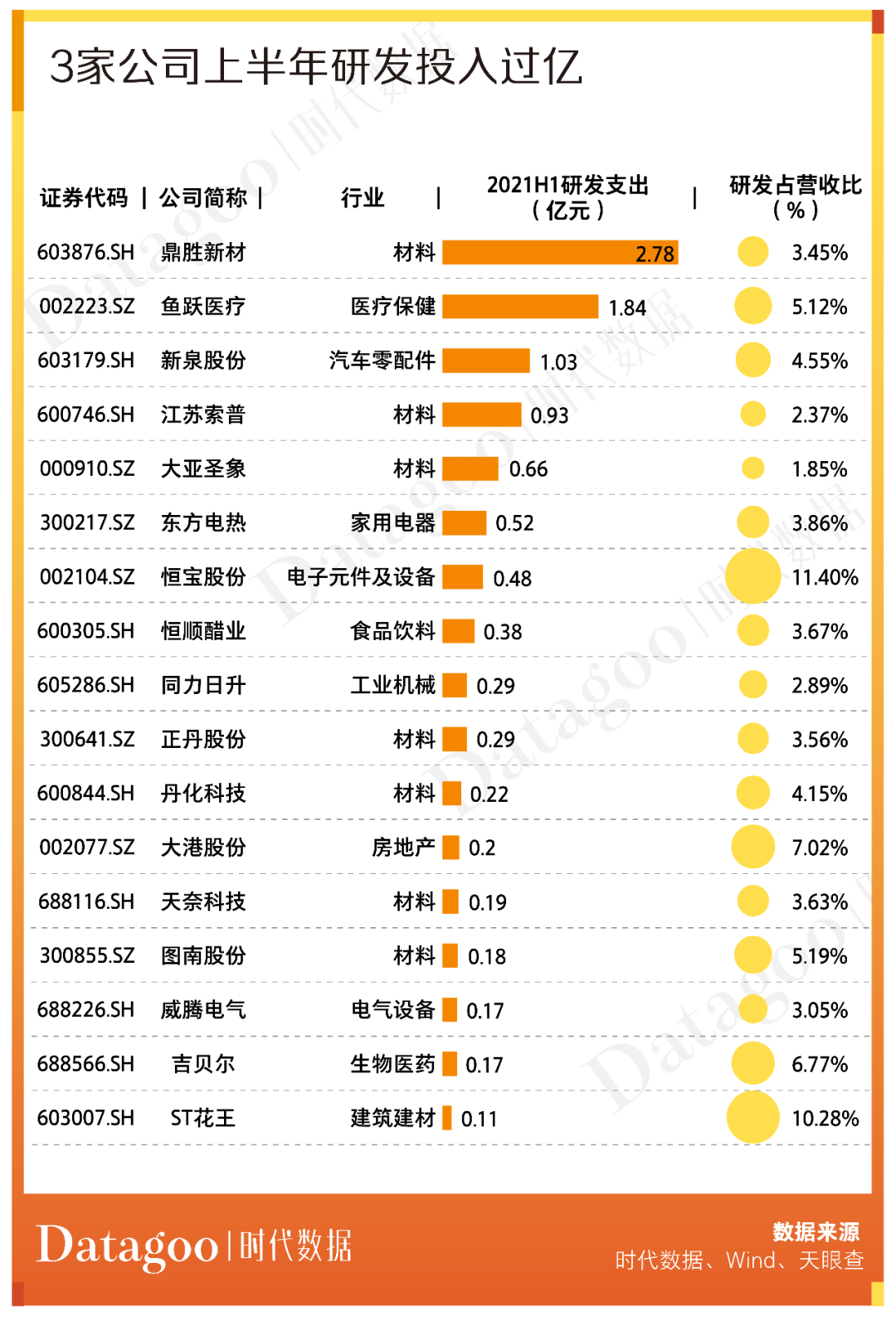 其中,鼎勝新材(603876)研發投入排在第一,為2.78億元,占上半年營收的3.45%;魚躍醫療(002223)研發投入排在第二,為1.84億元,占上半年營收的5.12%;國內領先的汽車內、外飾件系統零部件及模具供應商新泉股份(603179)研發投入排在第三,為1.03億元,占上半年營收的4.55%。
