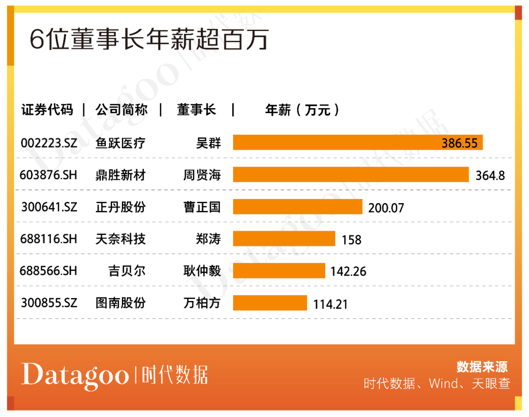 據時代數據統計,在這17家公司中,有6家公司的董事長2020年年薪超過100萬元。其中,魚躍醫療(002223)董事長兼總經理吳羣年薪386.55萬元,排在第一;鼎勝新材(603876)董事長周賢海年薪364.8萬元,排在第二;正丹股份(300641)董事長兼總經理曹正國年薪200.07萬元,排在第三。