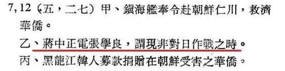 “蔣中正電張學良,謂現非對日作戰之時”,《中華民國史事日誌》1931年7月12日如此記錄。