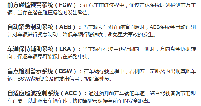 今年初,美國權威雜誌《美國消費者報告》公佈了目前主流的主動安全系統,主要包括FCW、AEB、LKA、BSW、ACC、ADAS等。