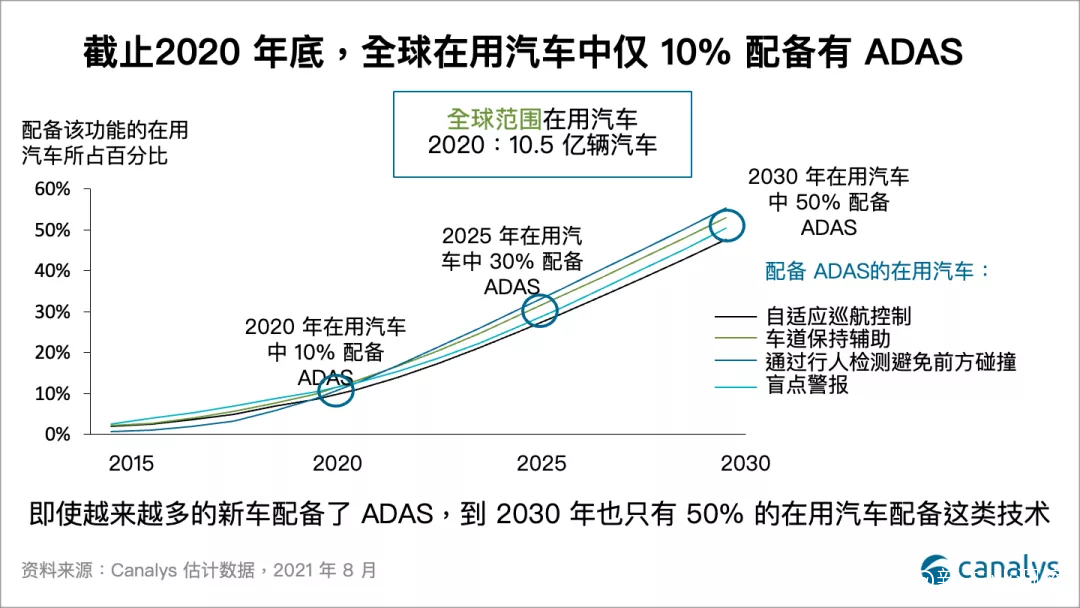 根據 Canalys預測,規模經濟將降低ADAS傳感器價格,到2025年約有30%的在用汽車能配備ADAS功能,2030年將增加到約為50%,這也是玩家以及新入局者伸出觸角的關鍵所在。