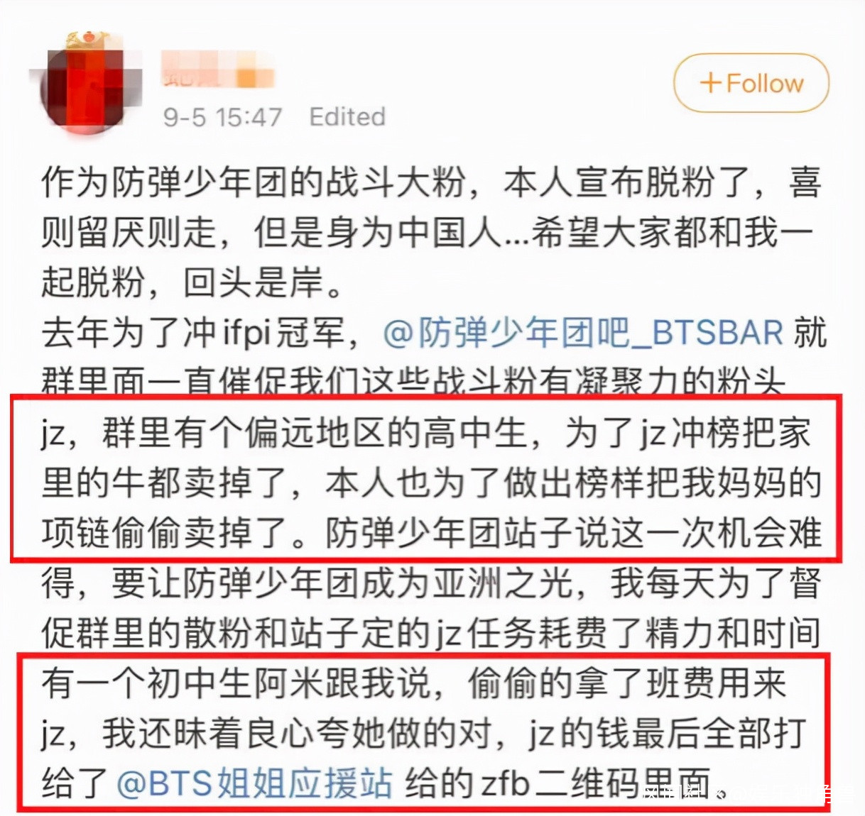 這種畸形不只是存在於某一個明星粉絲羣中。9月5日,一位自稱防彈少年團前戰鬥大粉的網友自曝,曾經為了幫助偶像衝榜,粉絲中有人偷偷賣掉了媽媽的項鍊、有人偷拿了班費等,高中生、初中生的身份界定也由此可見年齡構成。不過也有粉絲對此人的身份表示存疑,有故意挑撥之嫌。