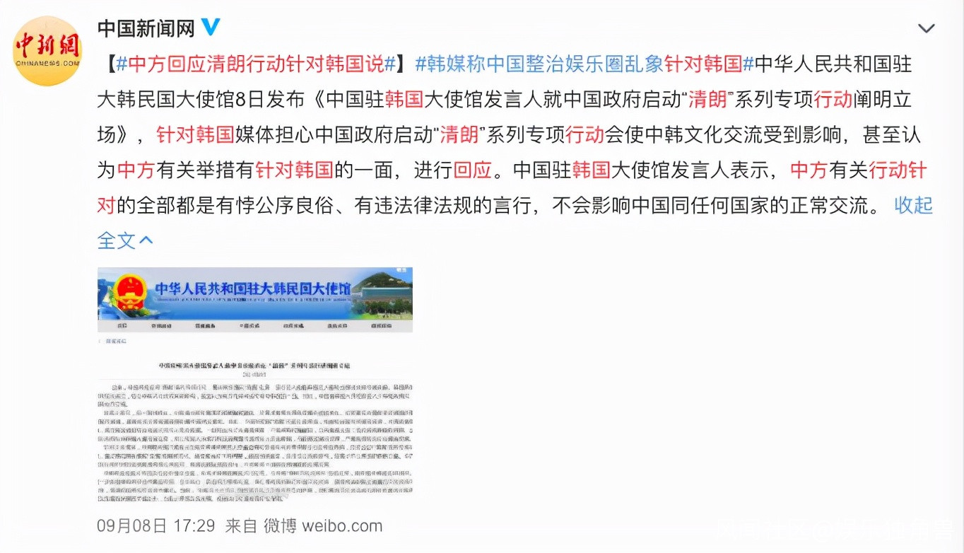 9月8日,針對韓媒報道稱中國政治娛樂圈亂象針對韓國的言論,中國駐韓大使館發言人表示,“針對的全部都是有悖公序良俗、有違法律法規的言行,不會影響中國同任何國家的正常交流”。隨後兩個話題先後登上微博話題榜,#中方回應清朗行動針對韓國説#閲讀量達到6.8億。