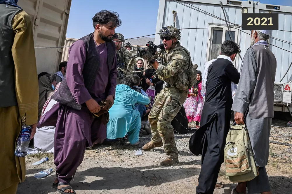 喀布爾機場,美士兵端起槍指向手無寸鐵的阿富汗民眾。圖源:網絡