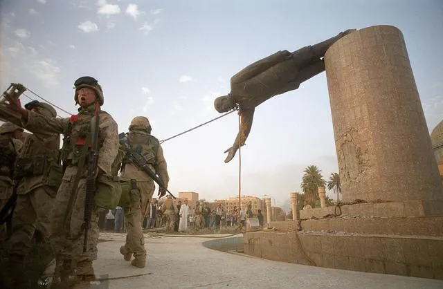 美軍在伊拉克推倒薩達姆雕像。圖源:美媒