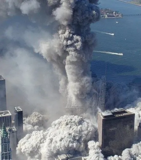 世貿雙子塔倒塌時的航拍照片(圖源:美媒)