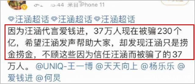 在 " 代言暴雷 " 這一方面,早前湖南台著名主持人汪涵就暴過雷,其所代言的產品被曝欠錢跑路,最後汪涵在社交平台上發佈一封措辭誠懇的情況説明才將事情暫時平息下去。