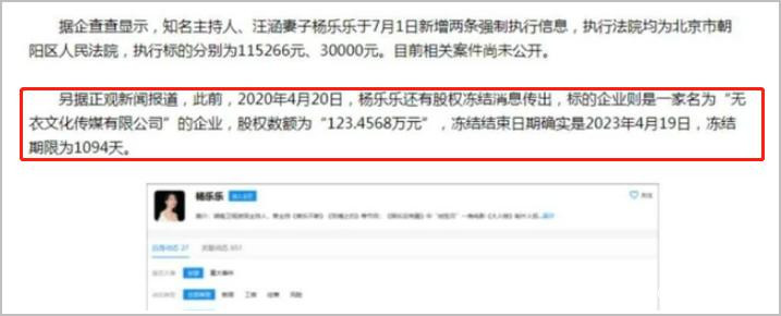 而另外一名主持人,同時也是汪涵妻子的楊樂樂在今年突然被曝出所開公司的 " 股權被凍,涉及金額 123 萬 " 的新聞,此前還成為 " 被執行人 “,雖然具體詳情外界並不知曉,楊樂樂稱自己有苦衷,但也引起人們猜測不斷。