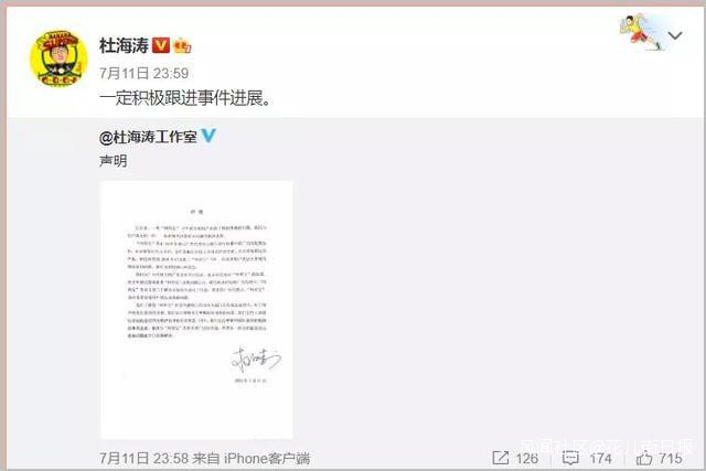 “,該言論發酵後杜海濤發聲明稱未與該產品簽署代言合同僅是短期合作並且表示一定 " 跟進此事 “,隨後杜海濤姐姐對其言論進行了道歉。