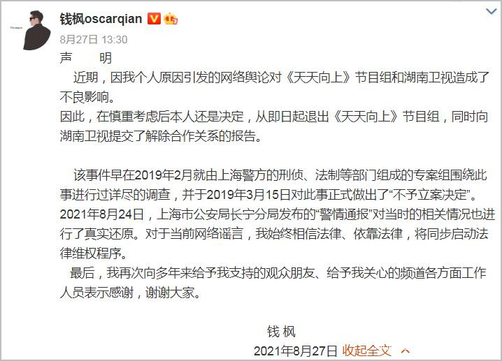 除 " 代言暴雷 “,” 餐廳整改 " 之外,還有涉及藝德的事件也牽涉上湖南台主持人,曾身為 " 天天向上 " 主持人的錢楓,被揭發涉嫌侵犯女性,該事件在網絡上鬧得非常大,隨後錢楓發了聲明否認指控,但同時錢楓也辭去了湖南台的工作。