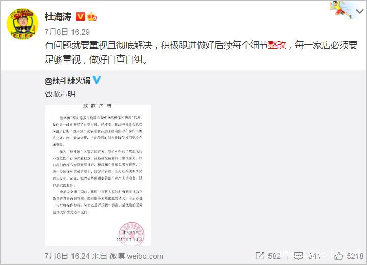 並且到了今年 7 月份,杜海濤和吳昕合開的火鍋店又 " 出事 " 了,據爆料該火鍋店衞生條件不合格被勒令停業整改,隨後杜海濤轉發餐廳聲明表示要整改!