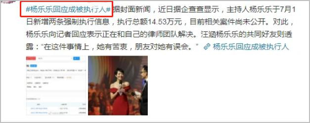 而另外一名主持人,同時也是汪涵妻子的楊樂樂在今年突然被曝出所開公司的 " 股權被凍,涉及金額 123 萬 " 的新聞,此前還成為 " 被執行人 “,雖然具體詳情外界並不知曉,楊樂樂稱自己有苦衷,但也引起人們猜測不斷。